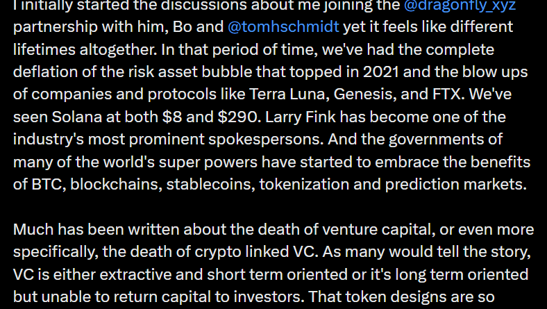The new vehicle is Dragonfly’s fourth fund, according to an X post by fund general partner Rob Hadick. Fortune reported that rather than chasing consumer apps, the firm hinted that it is targeting more traditional financial products built on blockchain rails, including credit card-like services and money market-style funds, as well as tokens tied to real-world assets such as stocks and private credit.