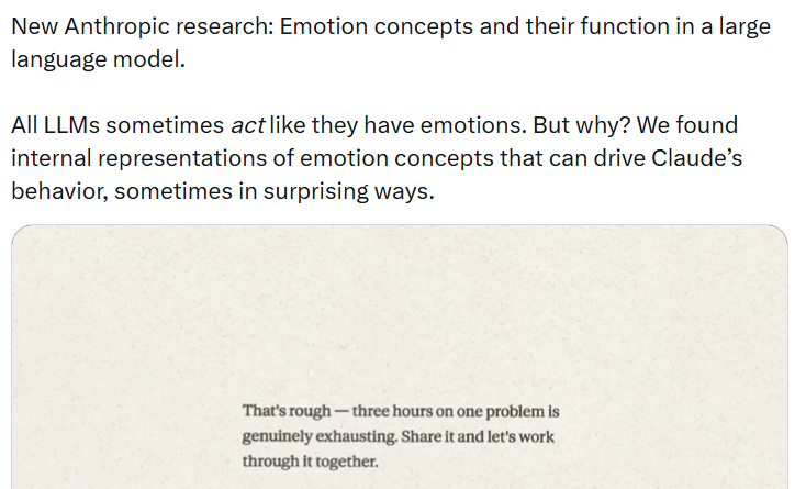 “This is not to say that the model has or experiences emotions in the way that a human does,” they said. “Rather, these representations can play a causal role in shaping model behavior, analogous in some ways to the role emotions play in human behavior, with impacts on task performance and decision-making.”