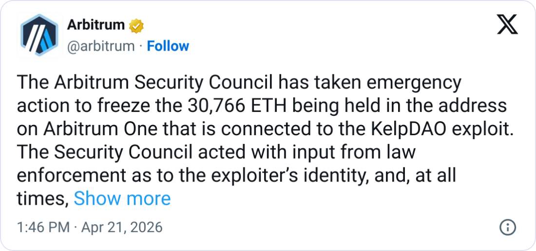 Arbitrum said on Monday that its security council, a 12-member body elected by the Arbitrum community, took “emergency action” to freeze 30,766 Ether (ETH) that was held in a wallet connected to the Kelp exploit.