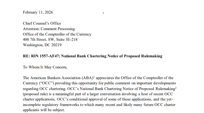 The ABA urged the OCC to be “patient,” resist applying traditional timing expectations to these applications, and ensure each charter applicant’s regulatory responsibilities “come fully into view” before moving applications forward.