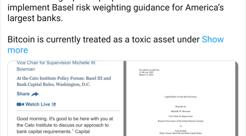 The 1,250% capital requirement means that banks must back any Bitcoin on their balance sheets at a 1:1 ratio with approved collateral, making holding the cryptocurrency more costly than other asset classes.