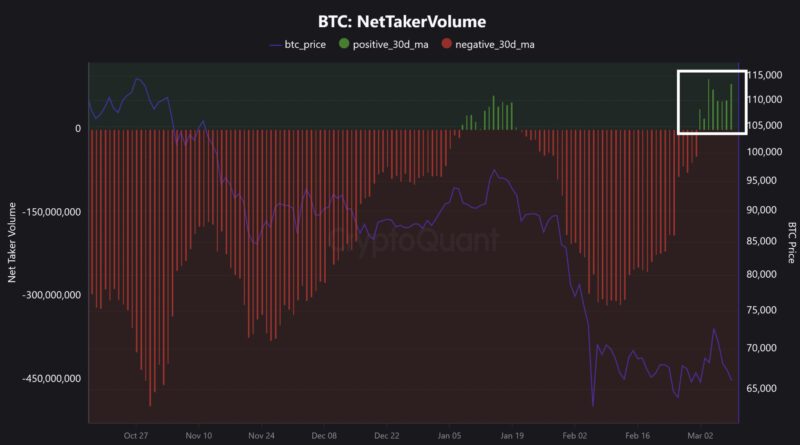 Bitcoin’s net taker volume suggests buyers are stepping in as demand for BTC derivatives returned, data from CryptoQuant shows.