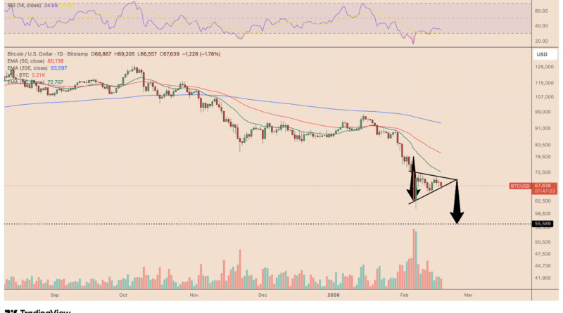 • A developing bear pennant keeps a BTC price drop toward $56,000 in play.