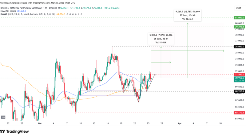 Bitcoin (BTC) is testing the $71,500 pivot, a key level across multiple timeframes and analysts noted that price action is tilted toward a possible rally to $80,000.