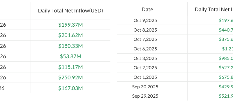Spot Bitcoin (BTC) ETFs added $199.4 million on Monday, bringing their seven-day streak to around $1.2 billion, according to data from SoSoValue. The latest inflows suggest continued institutional interest, though total inflows remain far below the roughly $6 billion seen during the October 2025 run.