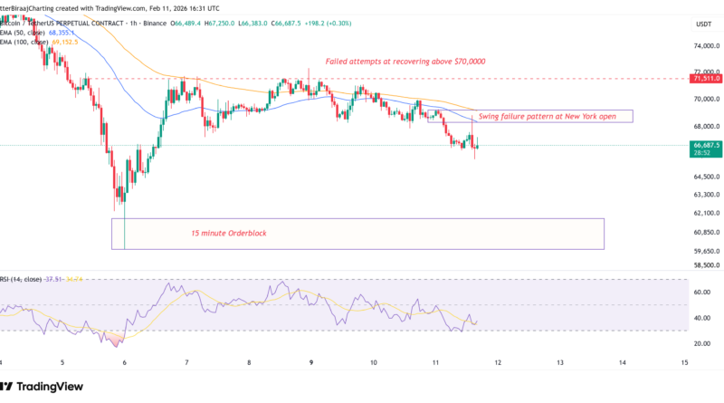 BTC’s price briefly pushed into intraday highs of $69,800 before reversing sharply during the New York session on Wednesday, forming a classic swing failure pattern. The move trapped breakout longs and accelerated downside momentum.