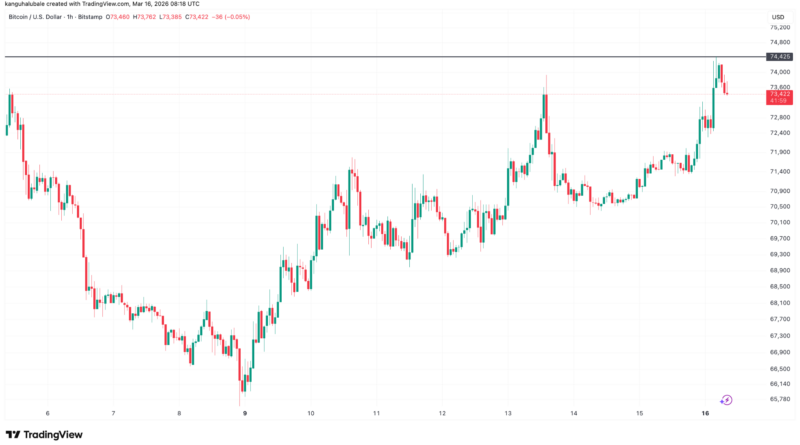 Data from TradingView showed 2.5% daily BTC price gains, with BTC/USD rising as high as $74,400 for the first time since Feb. 4.