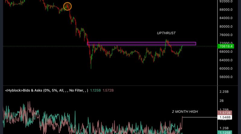 “Asks on Bitcoin just hit a 2-month high. $1.57B in sell-side liquidity stacked above price vs $1.125B in bids below.”