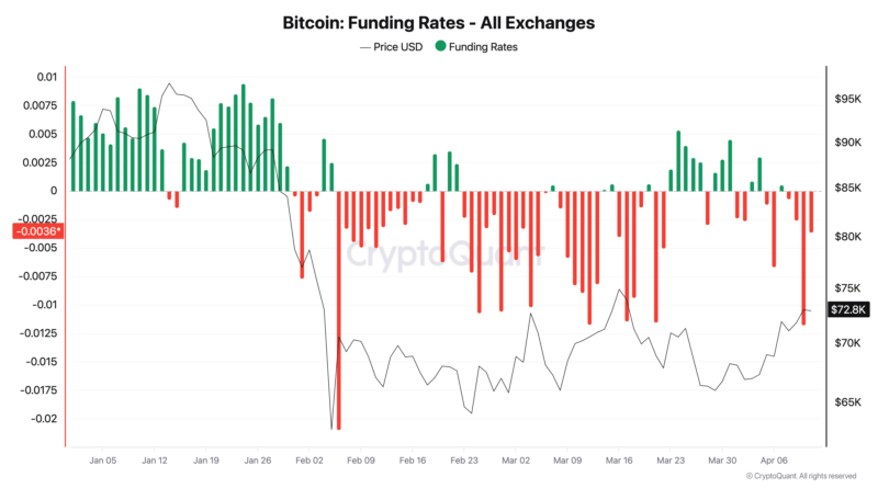 After BTC/USD passed $73,000 on Friday, traders appeared eager to trap those entering the market who were betting on continued price upside. Funding rates stayed negative on exchanges, while open interest grew to $24.2 billion — its highest since early March.