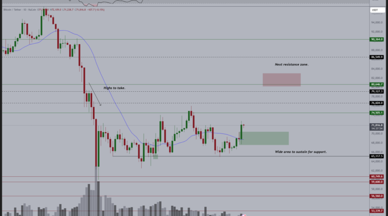 A daily candlestick close above this level would confirm the breakout, with the next line of resistance being the $76,000 range high.