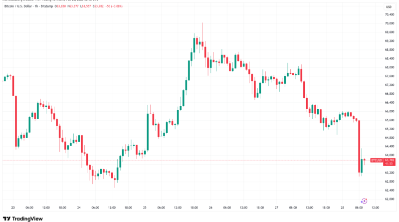 Data from TradingView showed BTC price action testing $63,000 as crypto markets reacted to the weekend’s events.