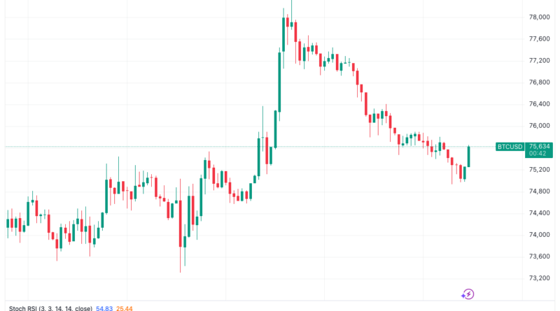 Data from TradingView showed BTC price pressure reentering after a trip to ten-week highs of $78,400 on Friday.
