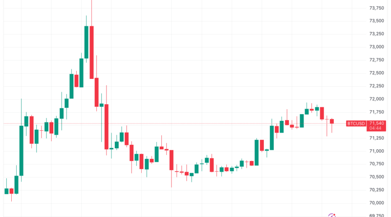 Data from TradingView showed out-of-hours price action topping out just below the $72,000 mark before cooling.