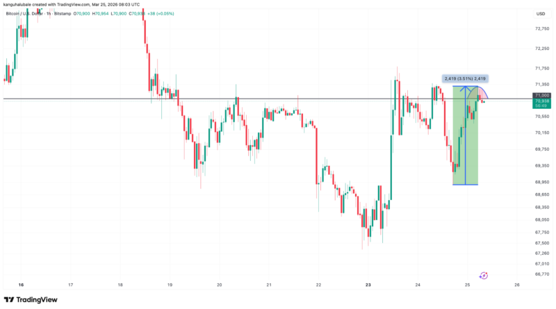 Data from TradingView showed BTC price rose as much as 4% to an intraday high of $71,300 from Tuesday’s low of $68,890, recouping all the losses incurred the day prior.