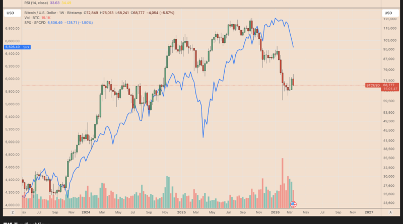 As of Sunday, BTC/USD had fallen 5.65% week-to-date to about $68,700, while the S&P 500 (SPX) closed the week down 1.90%.