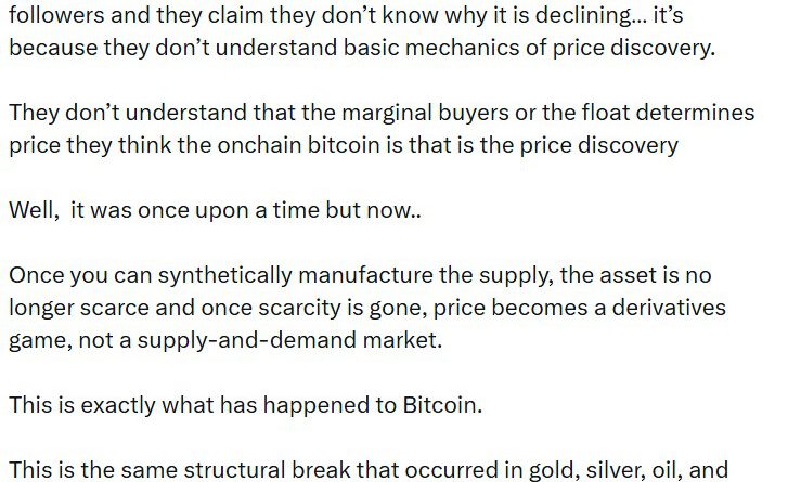 Robert Kendall, author of “The Kendall Report,” claimed he cracked it in his viral X post. He argued that Bitcoin’s valuation logic based on fixed supply “died” once cash-settled futures, exchange-traded funds (ETFs) and other financial instruments were layered on top of the asset.