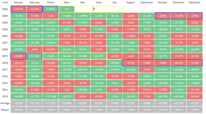 However, Bitcoin also tends to move in the opposite direction to March in April, and this is true for nine out of the past 13 years.