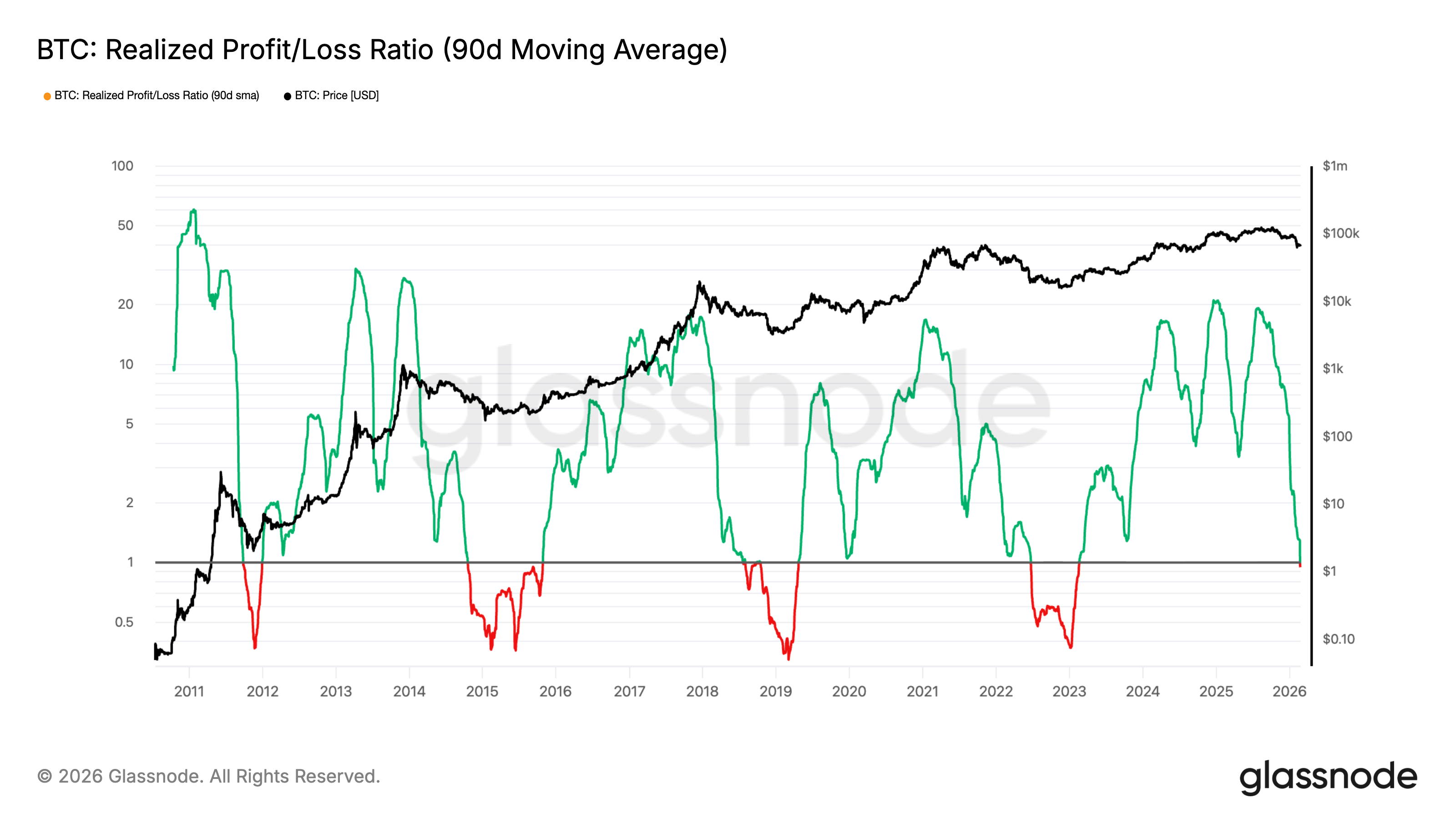 On Monday, Bitcoin’s realized profit/loss ratio (90-day moving average) slipped below 1.