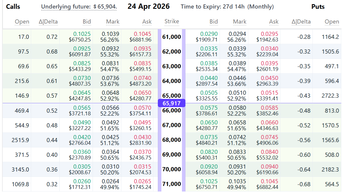 On Friday, the April 24 Bitcoin $66,000 put (sell) options traded at 0.0566 BTC or roughly $3,730. With a 53% implied probability of Bitcoin trading below $66,000 by late April, the mood remains decidedly bearish following the increased uncertainty in the US and Israel-Iran war, pushing traders into a risk-averse mode.