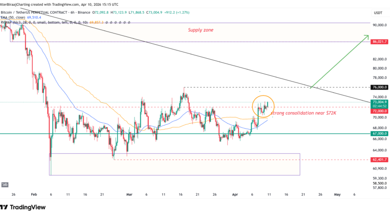 Bitcoin reached a weekly high of $73,255 on Friday after testing the $72,000 level earlier in the week, with the price compressing between $70,000 and $72,000 over the past four days. The higher price range is showing more stability for BTC than in March, when BTC quickly corrected after reaching the key level.