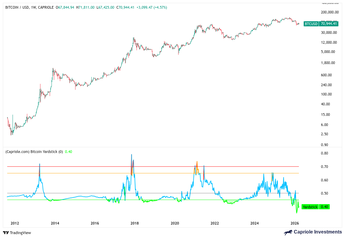 The Bitcoin Yardstick metric shows that price is in its “deep value” range.