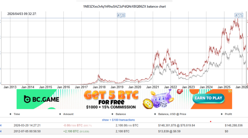 Onchain data from BitInfoCharts shows that the legacy address “1NB3ZX…” received 2,100 Bitcoin (BTC) on July 5, 2012, when BTC traded at about $6.59 per coin. At today’s prices, that stash is valued at roughly $147 million, turning an initial outlay of about $13,800 into an unrealized gain of more than 10,000x.