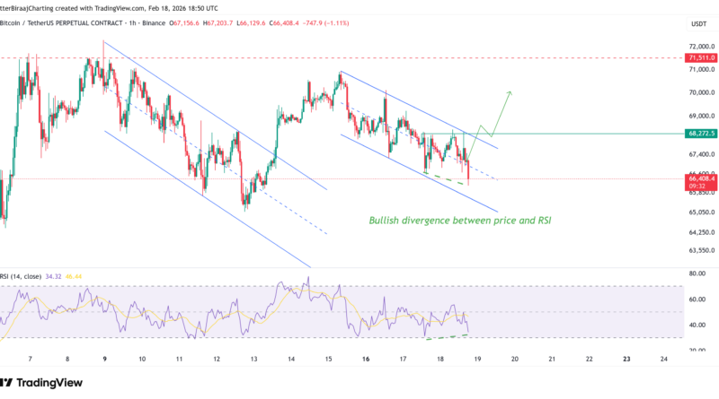 On the one-hour chart, Bitcoin is forming a descending channel similar to last week’s structure that preceded a move toward $70,000. Within this channel, a clear bullish divergence has developed in the relative strength index indicator (RSI).