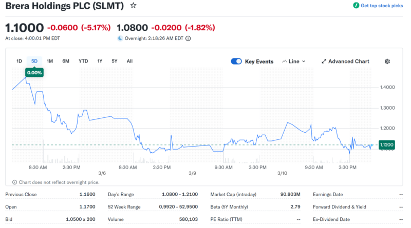Brera shares decline 5% during the day. Source: Yahoo Finance