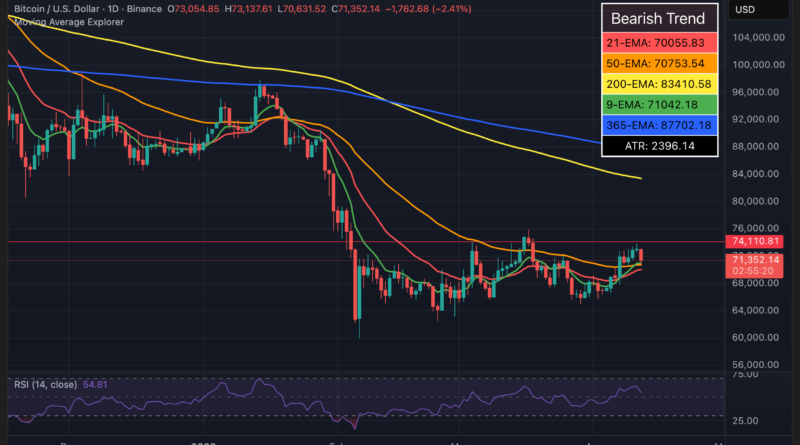 If Bitcoin closes the week above $71,000, it could signal continued upside for BTC, with resistance forming around the $74,000 level, he said. At last look, it was trading at about $71,276, according to TradingView data.