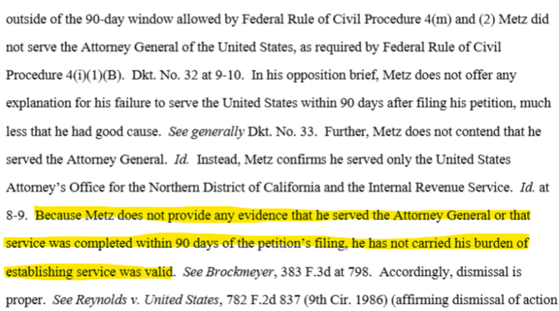 Metz acknowledged serving the US Attorney’s Office for the Northern District of California and the IRS, but admitted he did not notify the US Attorney General in Washington within the 90-day deadline, according to the court documents. Government lawyers argued it was sufficient grounds for dismissal.