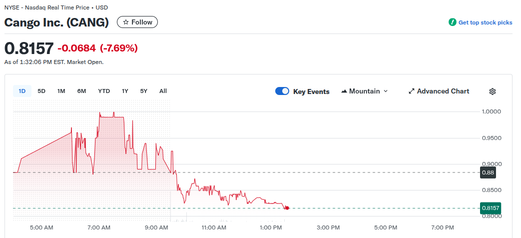 Cango’s stock price was down about 7.7% at time of writing, according to data from Yahoo Finance. Sector-tracker CoinShares Bitcoin Mining ETF was down 3.8%.