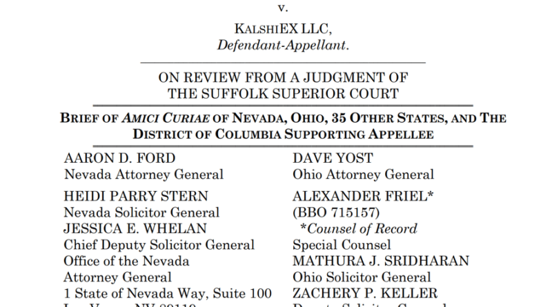 On Friday, a coalition of 37 states and Washington, D.C. filed an amicus brief supporting Massachusetts in its case against Kalshi, urging Massachusetts’ highest court to reject Kalshi’s argument that federal law allows it to offer sports betting nationwide without following state rules.