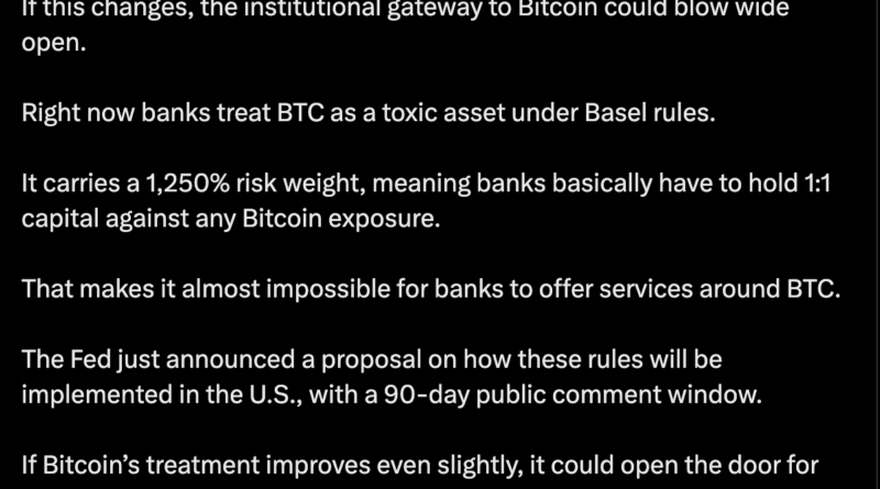 “The Fed just announced a proposal on how these rules will be implemented in the US, with a 90-day public comment window. If BTC’s treatment improves even slightly, it could open the door for banks to finally integrate BTC into the financial system.”