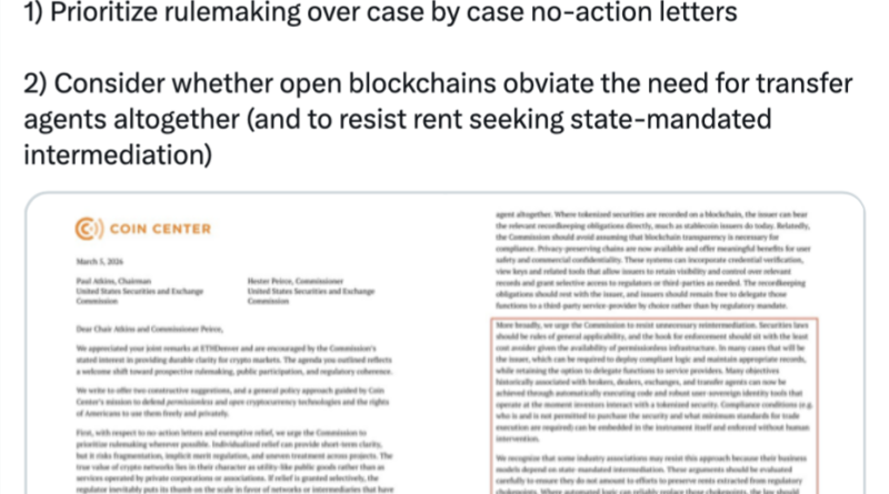 “Individualized relief can provide short-term clarity, but it risks fragmentation, implicit merit regulation, and uneven treatment across projects,” Coin Center said in a letter to the SEC, urging the regulator to „prioritize rulemaking wherever possible.“