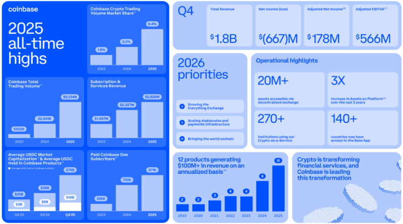 “In 2025, more than 12% of all crypto in the world resided on Coinbase,” the company said. “We’re building and connecting more products to facilitate customers doing more with their assets.”