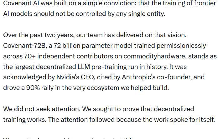 In a Friday post on X, Covenant AI founder Sam Dare said the team could no longer build on or raise for Bittensor because its governance was not meaningfully distributed.
