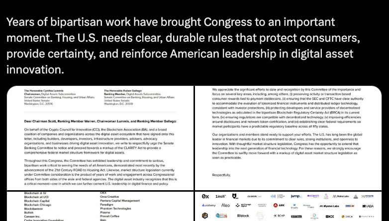 “We are now more than halfway through the 119th Congress, and it has been more than 270 days since the House passed the CLARITY Act with strong bipartisan support and we recognize the legislative window for this Congress is narrowing.”