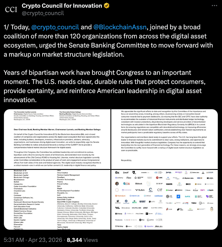 In a Thursday letter to leaders in the US Senate Banking Committee, the Crypto Council for Innovation (CCI) and Blockchain Association said that the body should “proceed towards a markup of the CLARITY Act to provide a comprehensive federal market structure framework for digital assets.”