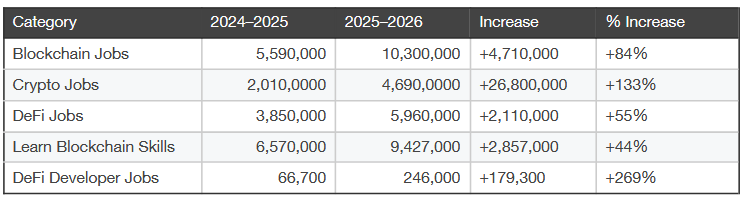 This has also been reflected in Google search statistics, said 1Inch, showing that Google search volume for “Blockchain jobs” grew 84% between 2024 and 2026.