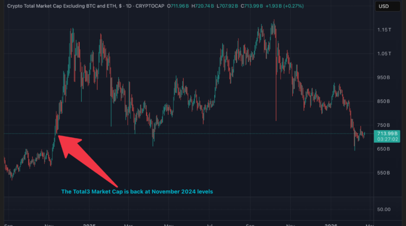 The Total3 Market Cap is about $713 billion at the time of publication, around the same level it was on November 10, 2024, with the market showing no signs of a sustained recovery.