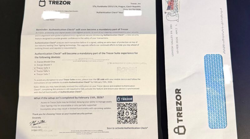 Cybersecurity expert Dmitry Smilyanets was one of the first to report receiving a spurious letter from Trezor on Feb. 13, which demands users perform an “Authentication Check” by Feb. 15 or risk having their device restricted.