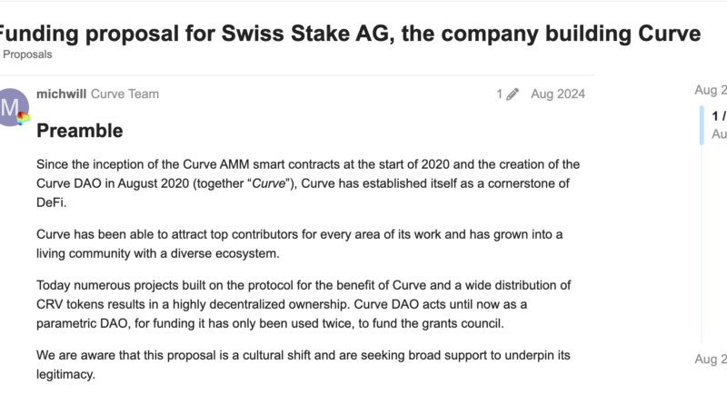 That earlier Curve DAO matter concerned a 2024 governance proposal to provide Swiss Stake AG, the main developer behind the Curve Finance protocol, with a grant valued at about $6.3 million at the time, which drew significant pushback from members of the Curve DAO.
