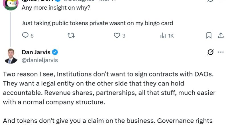 “The original idea behind governance tokens was coordination, not ownership… If they just become equity substitutes, then the experiment has basically collapsed back into the corporate model it was supposed to challenge,” he said.