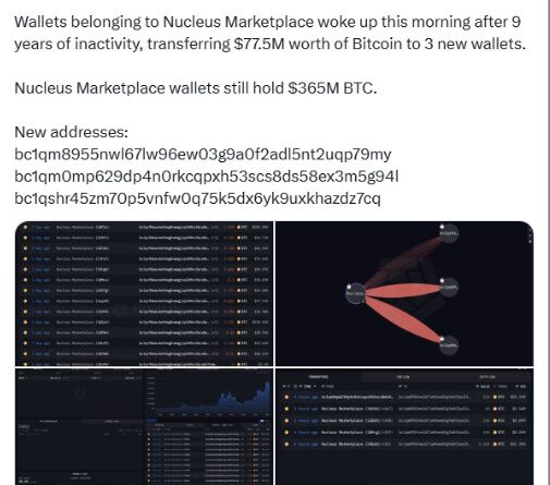 - Darknet Resurgence: A dormant Bitcoin wallet tied to the Nucleus marketplace has been reactivated after nine years.
