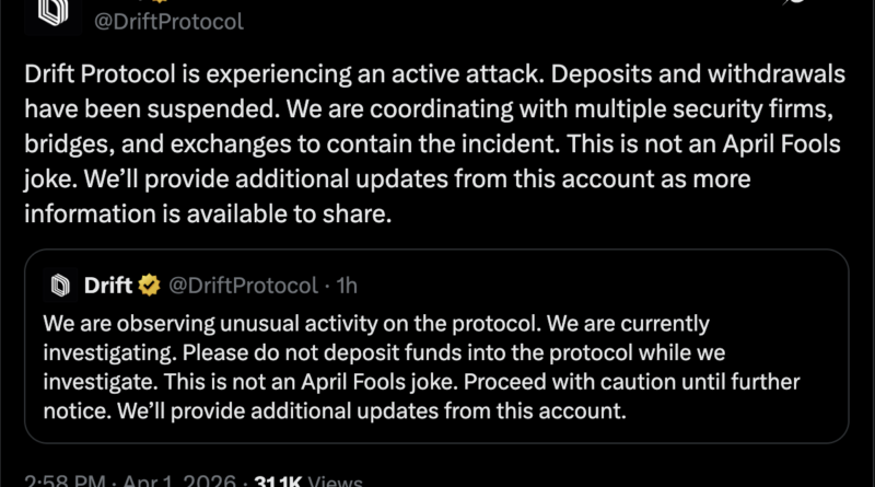 In a subsequent update, the Drift team announced that deposits and withdrawals on the platform have been suspended.
