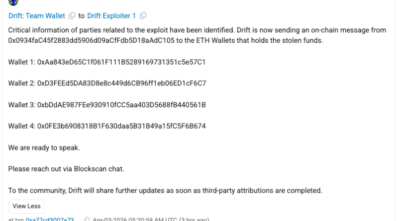 The team sent onchain messages from its Ethereum address (0x0934faC) to four wallets linked to the exploiter at the time of publication, urging the attacker to reach out via Blockscan chat. “We are ready to speak,” Drift said.