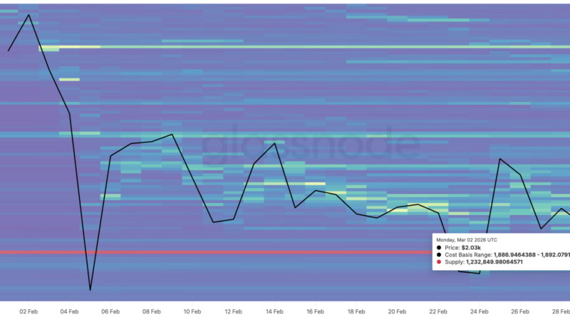 Ether’s cost-basis distribution heatmap shows strong support recently established around $1,800. This is where about 1.23 million ETH were acquired at an average price of $1,890 over the last 30 days.