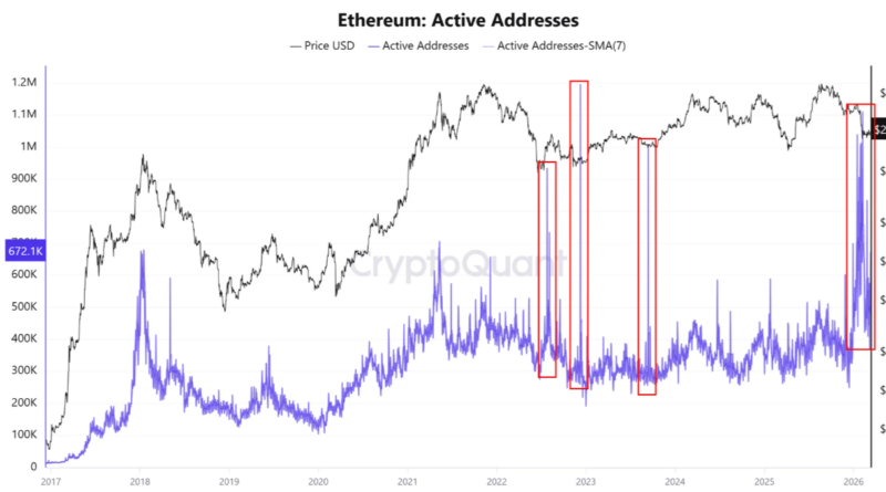 Although Ether’s price has fallen in 2026, network activity increased, with daily active addresses (DAA) rising to 1.1 million in February, the highest level since December 2022. The DAAs jumped by 80% to 672,170 from 370,390 in the past seven days.