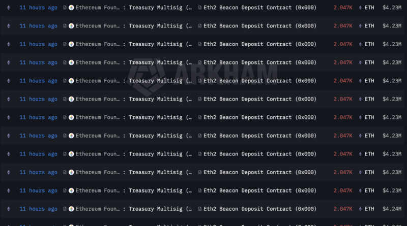 The EF staked the coins in a series of transactions, each consisting of 2,047 ETH, with the total amount staked on Friday valued at over $92.2 million, according to data from Arkham Intelligence.