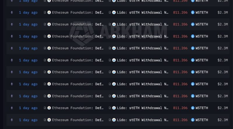 On Saturday, the Ethereum Foundation unstaked 17,035.326 ETH, worth roughly $40 million, according to Arkham data. The move involved depositing wrapped staked ETH (wstETH) into Lido’s unstETH contract, with ETH expected to be returned once the withdrawal queue completes.